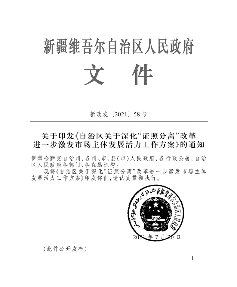 关于印发《自治区关于深化“证照分离”改革进一步激发市场主体发展活力工作方案》的通知