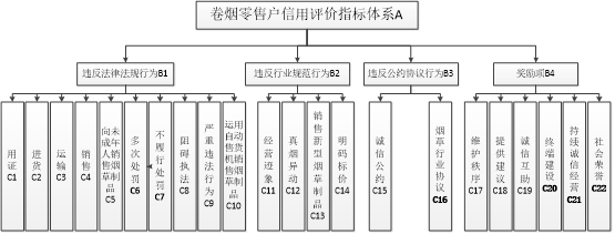 2.梳理零售客户信用评价指标。基于零售客户信用档案,从零售客户全要素管理角度出发,将卷烟零售客户信用评价指标体系确定为违反相关法律法规指标、违反行业规范经营指标、违反公约协议指标和奖励项指标四大类,构建包含4项一级指标、22项二级指标和58项三级指标的烟草零售客户信用评价指标体系。如图1所示: