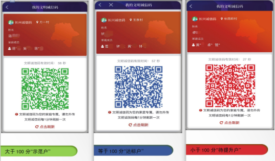 “文明诚信码”具体设置为三个等级,对应“绿、蓝、红”三色。“文明诚信示范户”为绿码(大于100分)、“文明诚信达标户”为蓝码(等于100分)、“文明诚信待提升户”为红码(小于100分)。